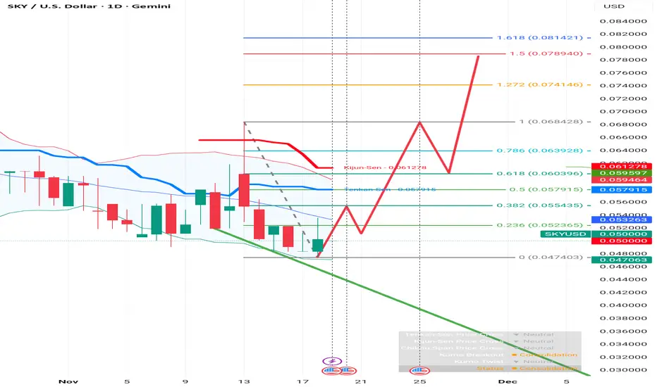 Ichimoku Elements: The price is currently below the Tenkan-Sen ($0.0579) and Kijun-Sen ($0.0612) lines. In Ichimoku theory, price below these lines typically indicates bearish momentum, meaning the price needs to cross above them to confirm a reversal.
