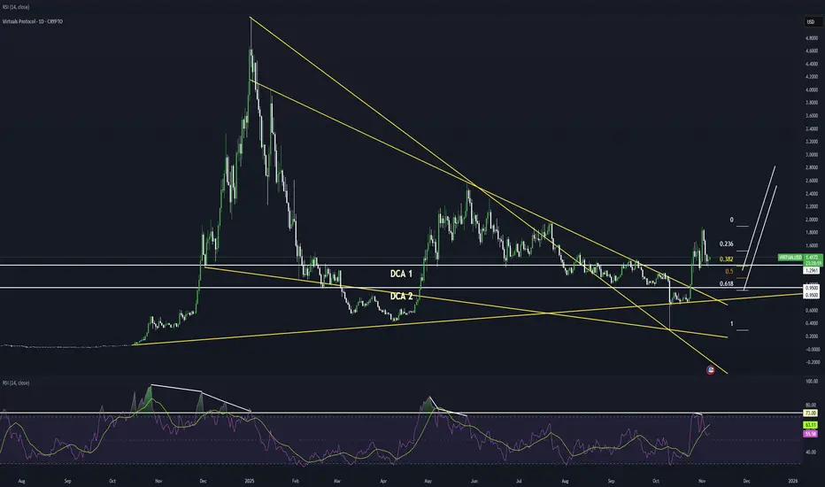 Virtuals Protocol seems to exhibit signs of overall potential Bullish momentum if the price action breaks the previous prominent Higher High with multiple confluences through key Fibonacci and Support levels which presents us with a potential Non-Levered buy and hold opportunity.