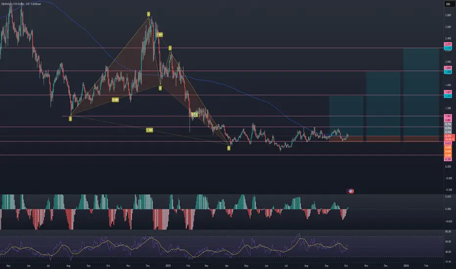 OP is still at/near the pattern completion zone of the potential Bullish Butterfly Harmonic Pattern. It's not perfect, but there is definitely an "M-shape" there and sellers are failing to push the price below .63 cents now for multiple months, which is a key level that goes all the way back to 2022. However, market participants are unable to create any local higher highs, which is somewhat concerning. Overall, it is probably more of a neutral likelihood of up vs. down here, but there is a lot of upside if market participants can keep the price above 63 cents long enough. Something to keep an eye on. Let's see what happens. It will be dependent on BTC not dumping here soon.