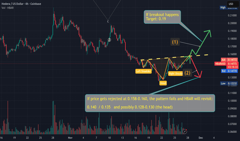 HBAR is potentially forming a bullish Inverse Head & Shoulders on the 4H timeframe, but the pattern is not confirmed yet. The neckline sits right at the 0.158–0.160 zone, which is the critical inflection point for the n