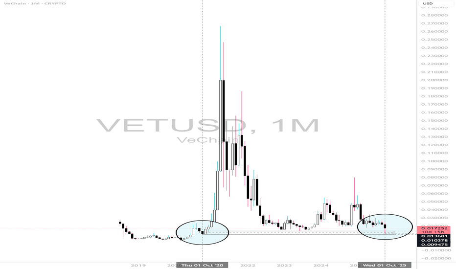 As of **October 2025**, VeChain (VET) has returned to the **same macro demand zone** that formed in **October 2020**, the foundation of its previous bull cycle.