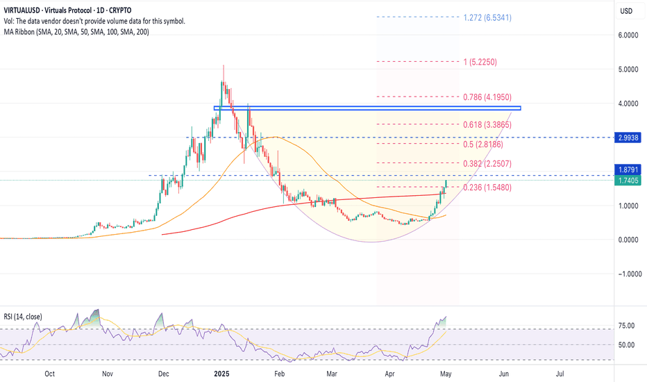 Virtuals Protocol (VIRTUAL/USDT) Price Heading towards new ATHThe daily chart of VIRTUAL suggests the price has triggered a parabolic recovery and may follow the curve to rise and reach the neckline. After securing the range above the 50-day MA, the price has surged above the 200-day MA, which could further head towards a Golden Cross. On the other hand, the R