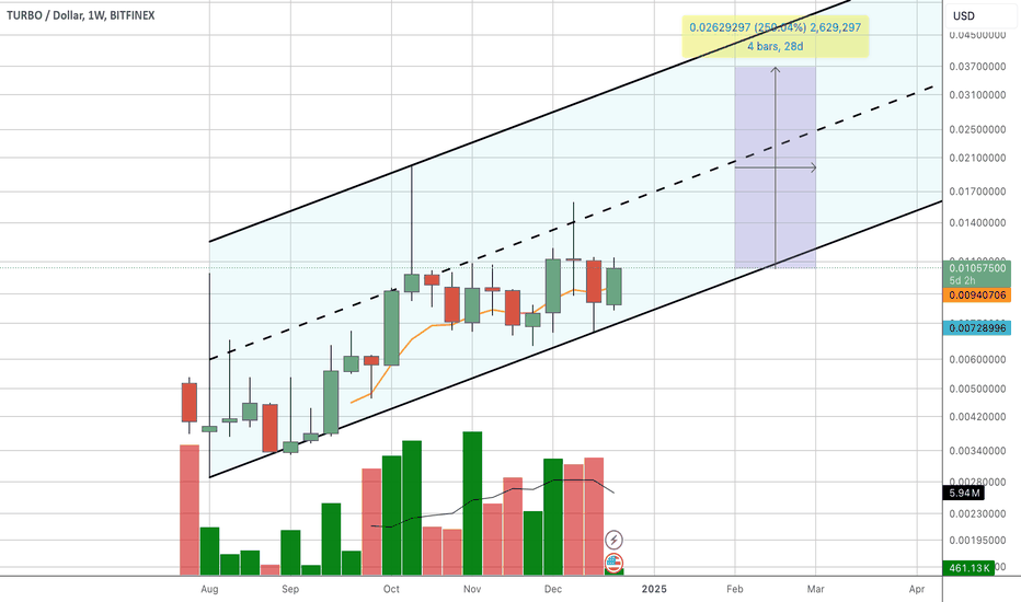 TURBO Cup and Handle FormationThe current cup and handle formation on the logarithmic parabolic trend suggests we'll see a distribution and consolidation phase throughout October. After November 5, the handle is expected to meet the parabola. Measuring the depth of the cup projects a price target of 0.045, which aligns with the